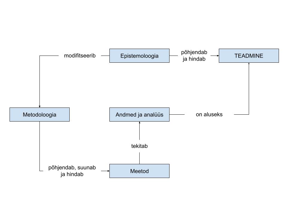 Meetod on teaduses tööriist teadmiste saamiseks objekti kohta. Metoodika on meetodite korrastatud kogum, mida ühe uurimistöö raames rakendatakse. Metoodika jaotab uurimisprotsessi osadeks, püstitab osadele eesmärgid ning sedastab meetodid eesmärkide saavutamiseks. Tõsikindlate teadmiste saamist metoodika põhjal nimetatakse ka metoodiliseks lähenemiseks uuritavale. Metodoloogia on õpetus metoodikatest ja meetodeist, ehk üldisemalt printsiipide süsteemist, mille kohaselt tegutsedes oleks väljavaateid usaldatavate tulemusteni jõudmiseks2. Epistemoloogia ehk teadmisteooria on aga filosoofia valdkond, mis tegeleb teadmise päritolu, loomuse ja piiridega (vt joonis).
